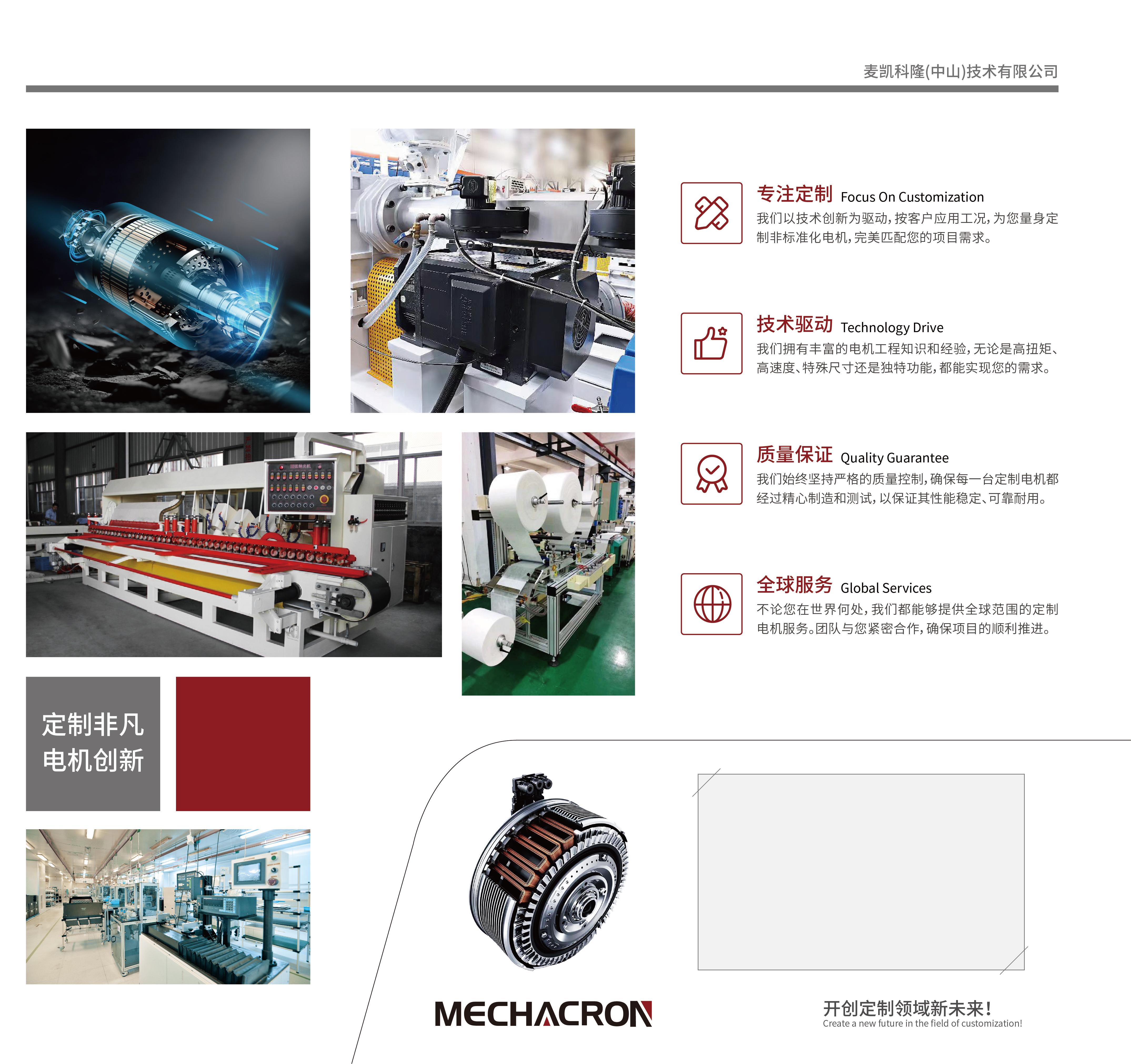麦凯科隆是由日本CADCRON参与建设的电气机械科技一体化公司,借鉴成熟稳定的混动汽车普锐斯的先进电机设计制造经验,2012年开始联合研发塑机专用永磁电机产品,经过多年的积累,以创新的技术,卓越的解决方案和优质的产品坚持不懈地为制造业提供全面支持,通过不断创新以适应客户的特定需求,形成先进的技术研发能力。产品除在头部塑机企业应用外,在陶瓷机械,铝材设备,玻璃机械,汽车测试设备,电池设备等其他行业也广泛应用,获得客户的一致认可。麦凯科隆始终以客户需求为中心,聚焦在产品技术航道进行持续创新,致力于为客户提供这对定制化有竞争力的电机及塑机辅机相关产品,为工业自动化及国家的“双碳”计划贡献自己的力量。